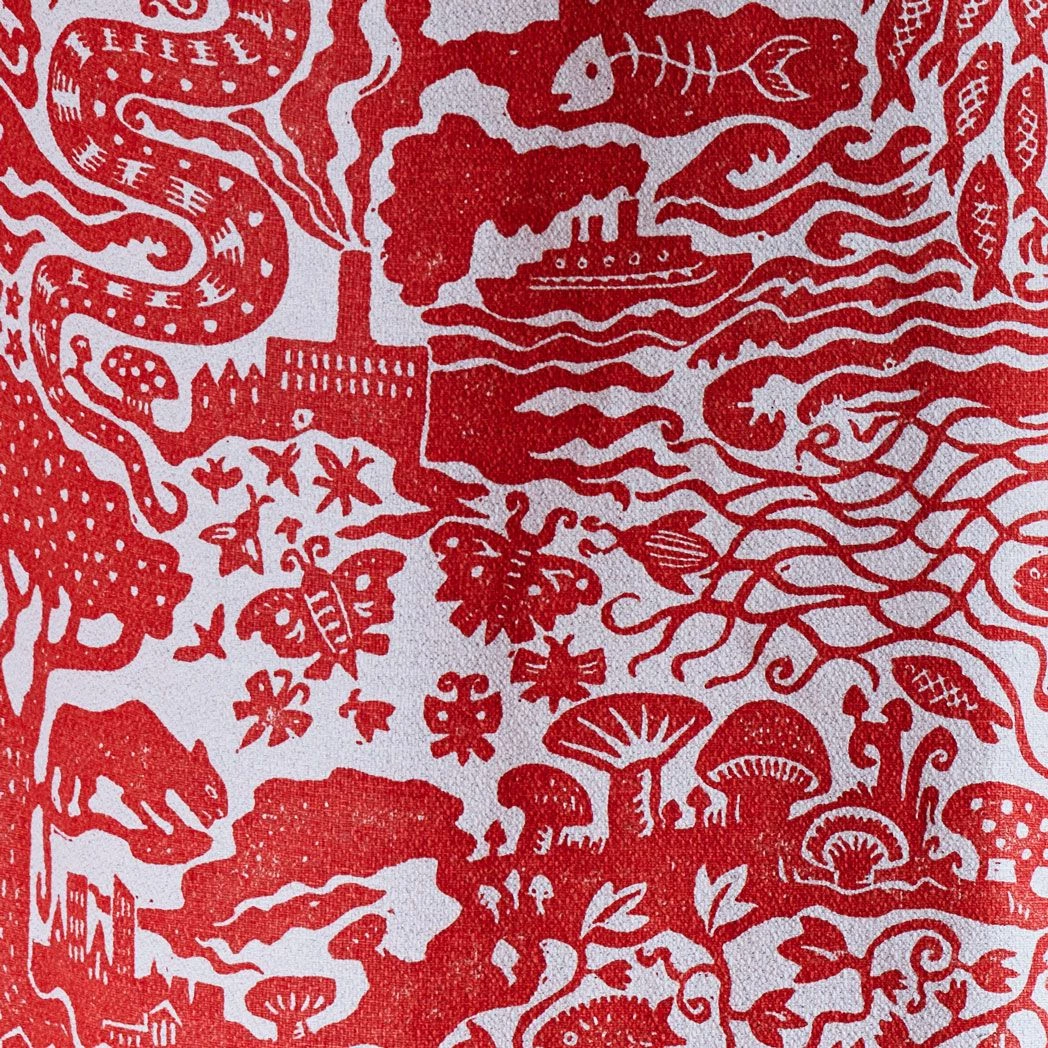 The Monkey Puzzle Tree collaborated with Alexis Snell, who specialises in lino cut prints. This print subtly pushes a message about humankind’s impact on the planet and explores the juxtaposition between the natural and industrial world. Flocks of swallows morph into aeroplanes and factory fumes mingle with skulls and snakes.Â