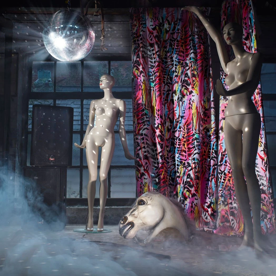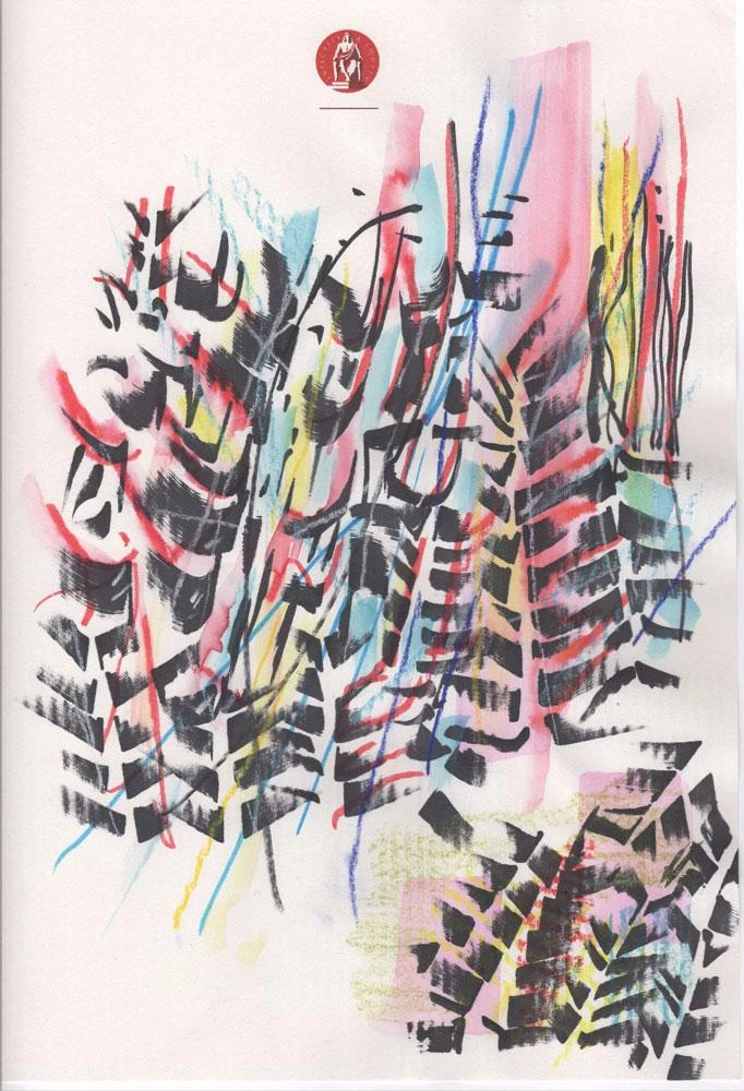 This expressive, graffiti-like painting portrays a wild and decadent world paired with the black tribal markings and feathers incorporated with the vibrant, pinks, reds, yellows and turquoise.Â
