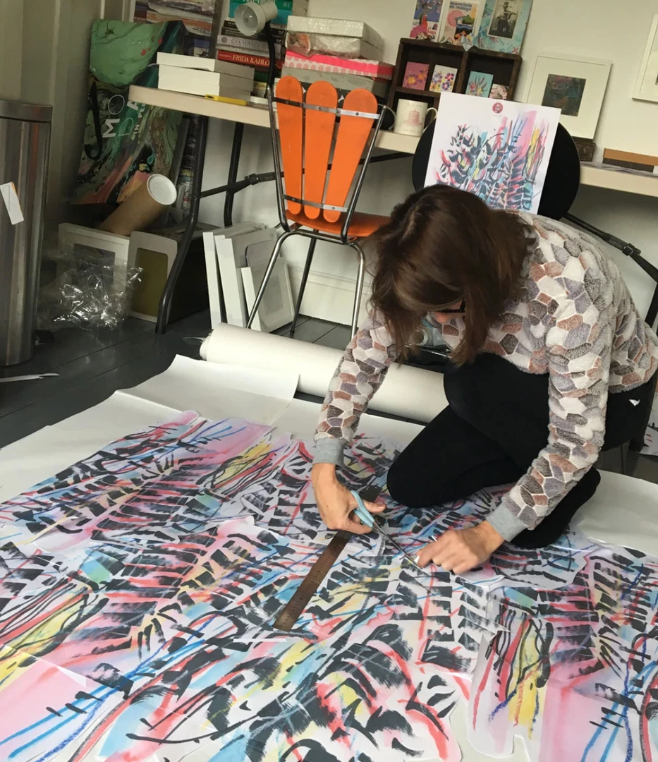 The Monkey Puzzle Tree collaborated with Sarah Thornton to create a fabric depicting freedom, colour and self-expression. The artwork was inspired by her late mother, she has used black marker pens, watercolour and wax crayons to illustrate her huge appetite for life. Sarah’s mum loved nothing better than a night out at legendary London jazz club, Ronnie Scott’s.Â