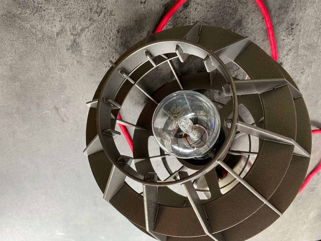 | Material | Nickle / Brushed Surface Ceiling fixing: metallic brushed Red fabric cable 120 cm length from top of lamp