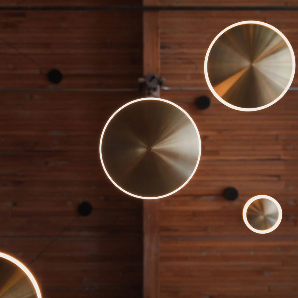 Mimicking the phosphorescent envelope found around the stars, Chrona lights create a luminous glow by combining spun brass and diffused acrylic. Available in brass or stainless steel with a variety of both horizontal and vertical orientations, dish pendants can be clustered together to create constellations or solo – as beautiful as a shooting star. Â